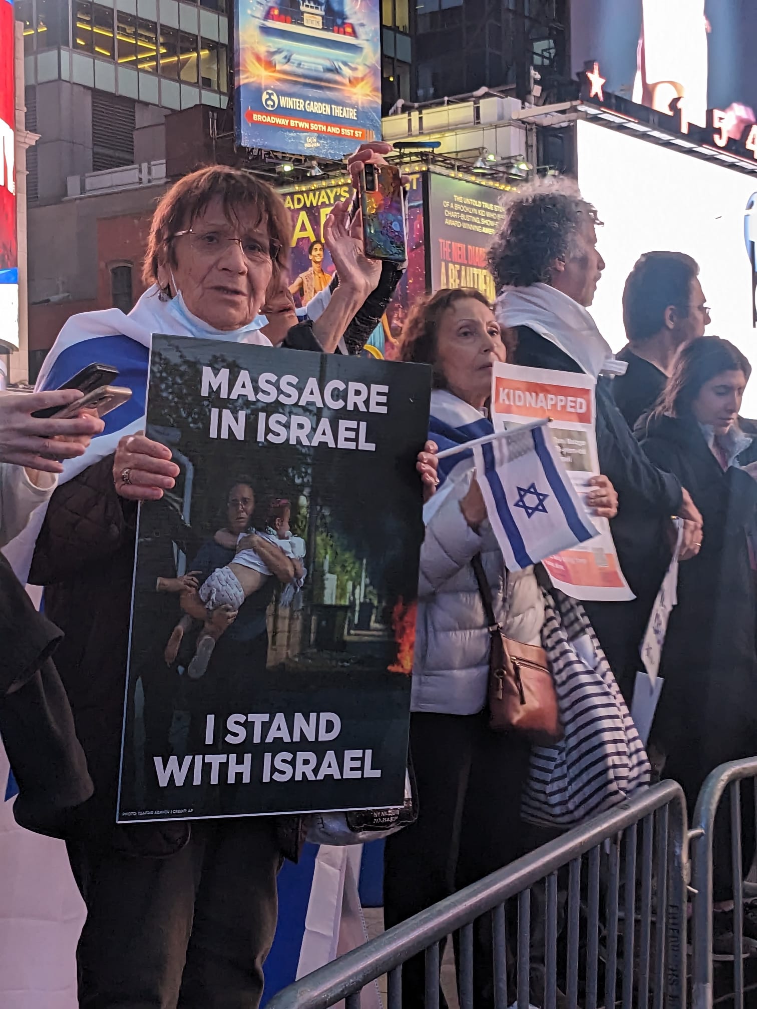 Mii de oameni s-au așezat în Times Square ținând poze ale celor 200 de ostatici – unii dintre ei chiar bebeluși.