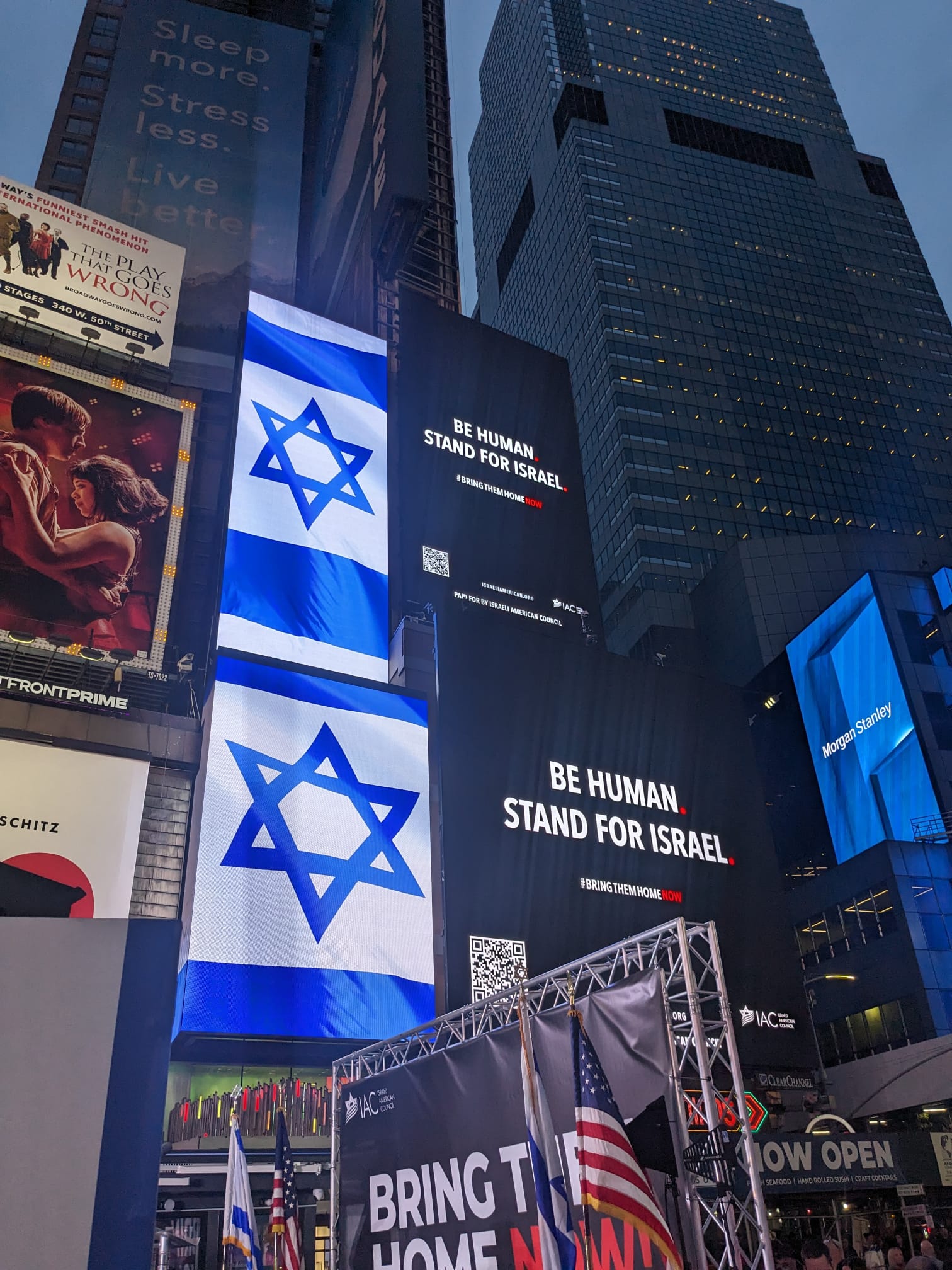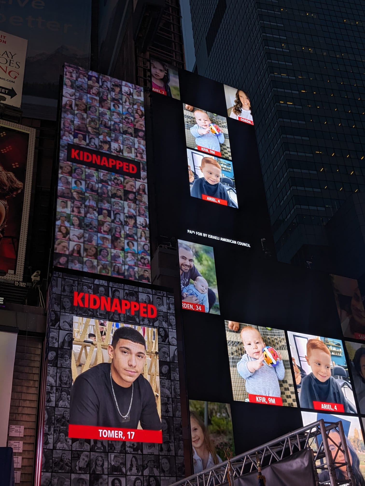 Acțiunea a fost organizată de Coaliția organizațiilor evreiești pentru a „aduce lumină” asupra miilor de familii care nu știu dacă cei dragi sunt vii sau morți. La acțiune, în Times Square, a fost prezent și primarul orașului New York, Eric Adams, membrii familiilor ostaticilor și alții care au luat „poziție pentru umanitate”.