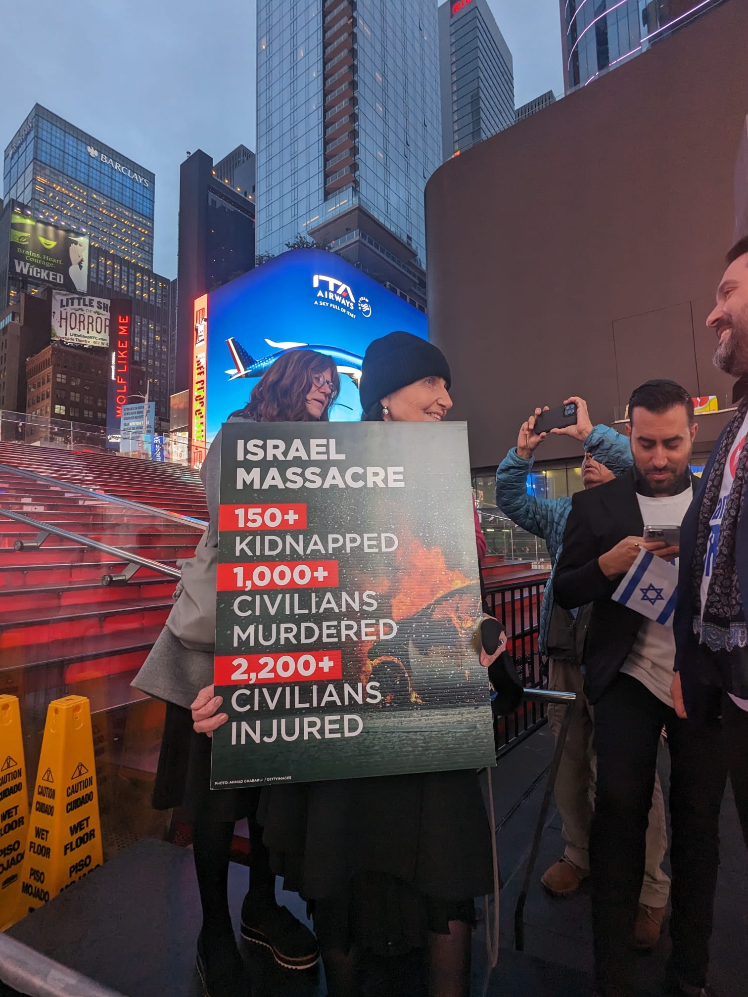 La 14 zile de la atacurile Hamas, cea mai importantă intersecție din New York, Times Square s-a transformat în tribuna pentru manifestul „Bring Them Home Now” – „Aduceți-i acasă acum!”. La mitingul de joi seara, 19 octombrie, fețele celor 200 de ostatici israelieni răpiți de Hamas au fost proiectate pe clădirea impunătoare.
