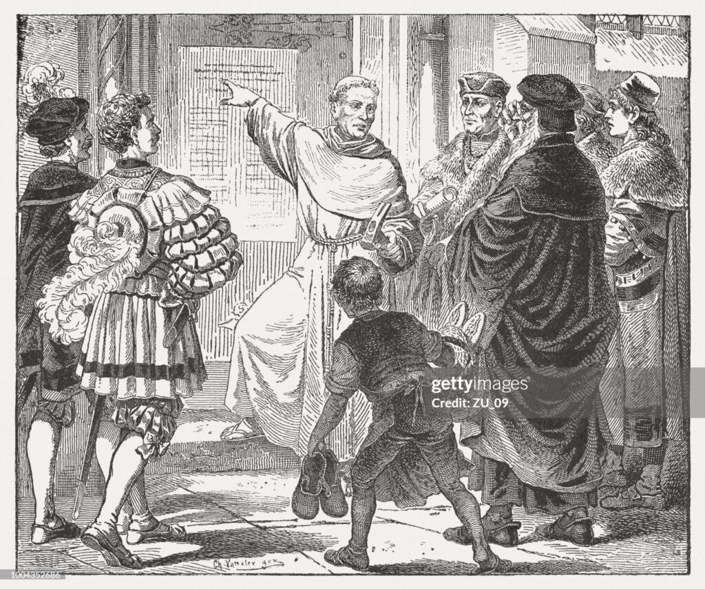 În ziua de 31 octombrie 1517, un călugăr din ordinul augustinilor și profesor la Universitatea din Wittenberg, avea să pună pe ușa din biserica din localitate (care funcționa în aceea epocă ca afișier) o listă de 95 de teze, de subiecte, prin care solicita lumii academice să dezbată o problemă de foarte mare actualitate și anume utilitatea și justețea folosirii indulgențelor. Această dată este considerată ziua de naștere a protestantismului, deși în acel moment, Luther nu a intenționat să producă o ruptură în cadrul Bisericii Catolice, dovadă că tezele au fost scrise în limba latină.
