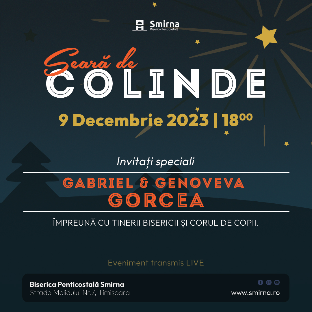 Sâmbătă, 09 decembrie 2023, Biserica Penticostală „Smirna” din Timișoara dă startul sezonului de colinde. Invitații serii sunt familia Gabriel și Genoveva Gorcea, alături de tinerii și corul de copii a bisericii locale.