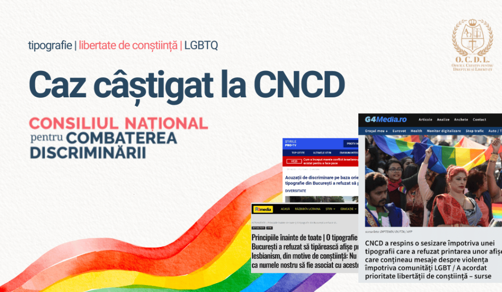 Consiliul Național pentru Combaterea Discriminării (CNCD) a dat câștig de cauză tipografiei din București care a refuzat printarea unor afișe ce conțineau mesaje de susținere a comunității LGBTQ+, recunoscându-se astfel prioritatea libertății de conștiință.