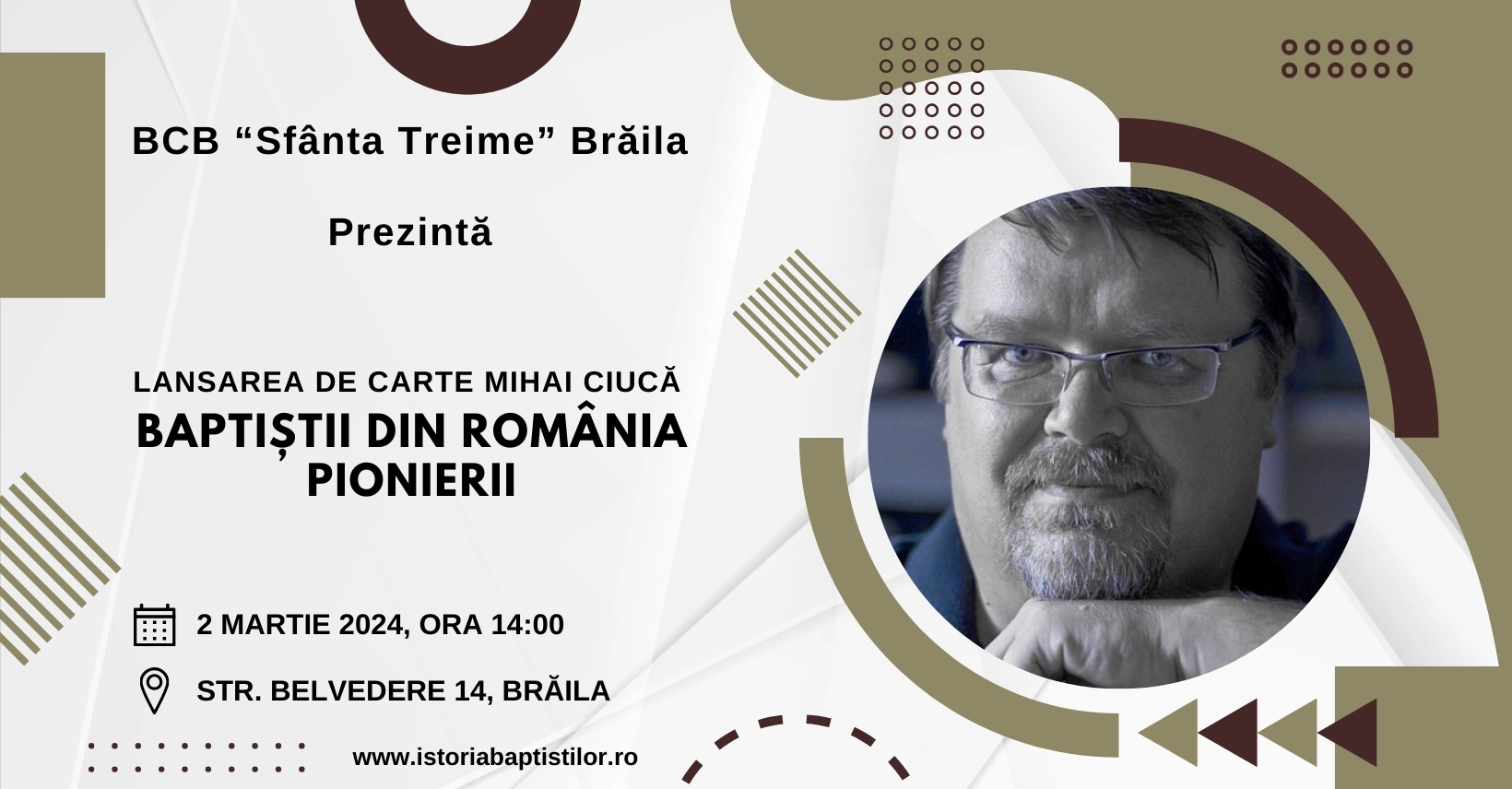 Vă invităm sâmbătă, 2 martie 2024, ora 14:00 la primul eveniment de lansare în România a celor trei volume inedite: „Baptiștii din România: Pionerii”, scrisă de Mihai Ciucă. Evenimentul va fi găzduit de Biserica Baptistă „Sfânta Treime” din Brăila, acasă la Mihai Ciucă, pe adresa: Str. Belvedere nr. 14.