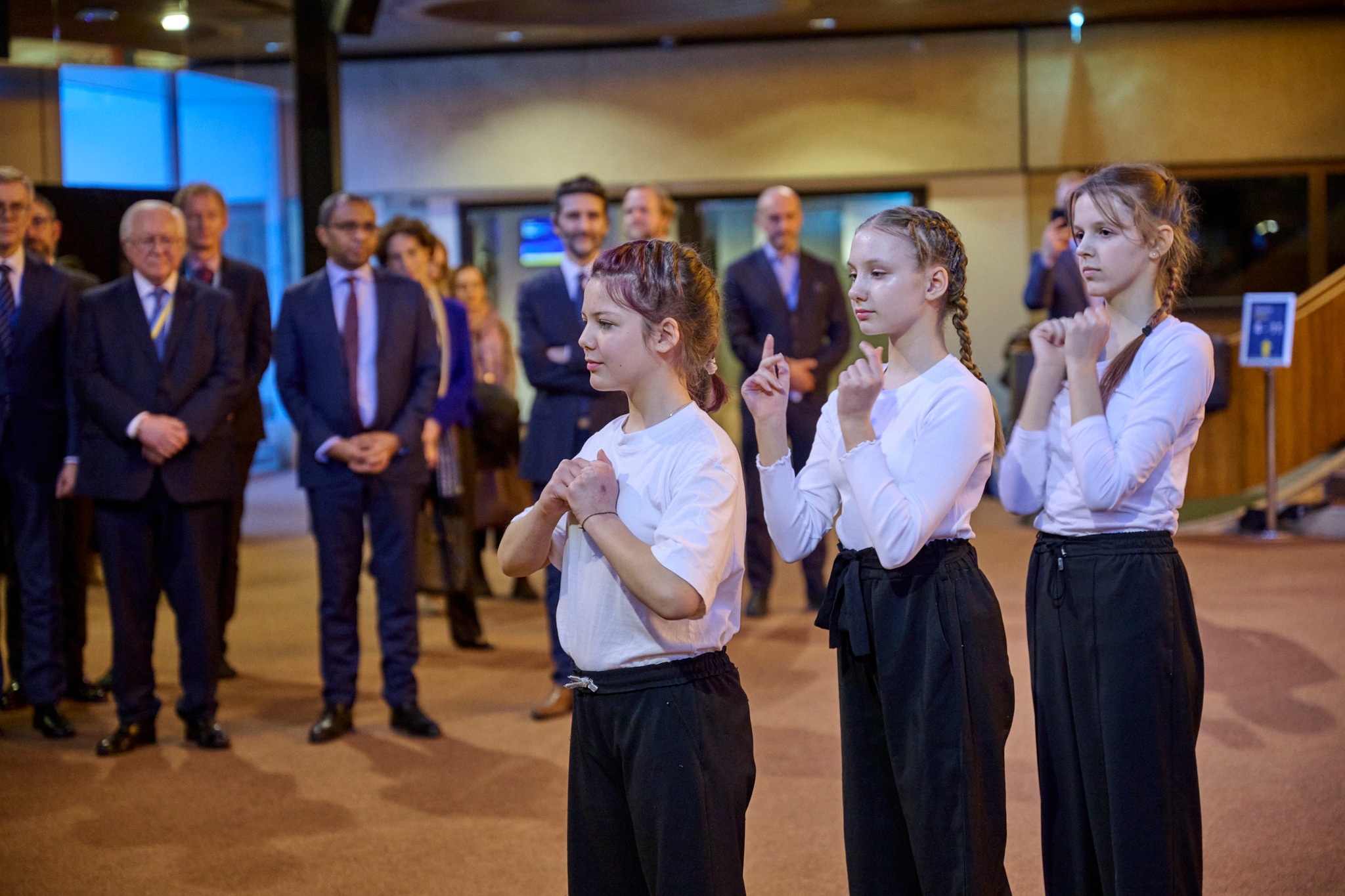 În cadrul ceremoniei au fost interpretate atât imnul național al Ucrainei, cât și imnul european, care este urmat de o ședință extraordinară a adjuncților miniștrilor (ambasadorilor), care va fi transmisă în direct. La întâlnire se vor discuta consecințele agresiunii Federației Ruse împotriva Ucrainei.