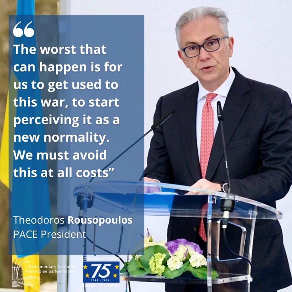 „Cel mai mare rău care ni se poate întâmpla este să ne obișnuim cu acest război, să începem să-l percepem ca pe o nouă normalitate. Trebuie să evităm acest lucru cu orice preț”, a declarat astăzi președintele APCE, Theodoros Rousoupolus, în cadrul ceremoniei de marcare a doi ani de agresiune al Rusiei împotriva Ucrainei.