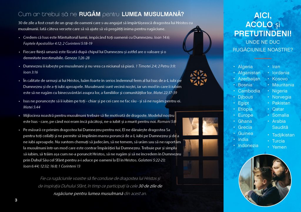 Acest ghid de rugăciune vă va ajuta să vă rugați pentru musulmani aici, acolo și pretutindeni, și vă va inspira să vă rugați în special pentru comunitățile musulmane cele mai apropiate de dumneavoastră, unde puteți fi o lumină și o binecuvântare pentru ei, spre slava lui Dumnezeu.