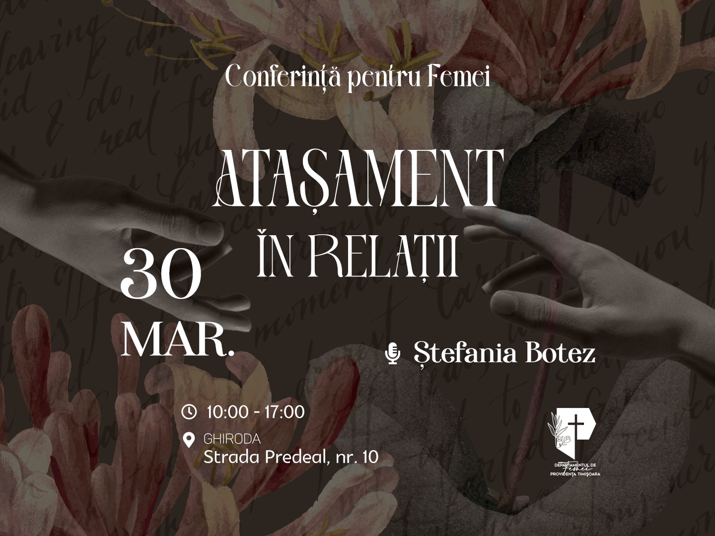 Sâmbătă, 30 martie 2024, Biserica Baptistă „Providența” din Timișoara este gazda celei de-a IV-a ediții a Conferinței pentru femei. Ediția 2024 are ca temă „Atașamentul între relații” și invitată în calitate de speaker, președinta Asociației Consilierilor Creștini din România (ACCR), Ștefania Botez.