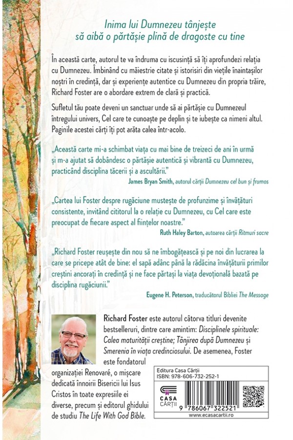 Inima lui Dumnezeu tânjește să aibă o părtășie plină de dragoste cu tine. În această carte, autorul te va îndruma cu iscusință să îți aprofundezi relația cu Dumnezeu. Îmbinând cu măiestrie citate și istorisiri din viețile înaintașilor noștri în credință, dar și experiențe autentice cu Dumnezeu din propria trăire, Richard Foster are o abordare extrem de clară și practică.