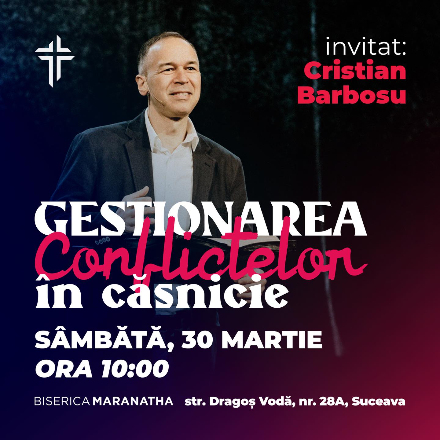 Ce ne învață Scriptura cu privire la situațiile conflictuale din familie? Cum să le gestionăm corect? Cum trecem peste obstacole în căsnicie și cum îl putem slăvi pe Dumnezeu prin viața de familie? Aflăm răspunsuri prețioase din Scripturi împreună cu pastorul Cristian Barbosu sâmbătă, 30 martie 2024, la Biserica Baptistă „Maranata” din Suceava, pe str. Dragoș Vodă, nr. 28A, Suceava.