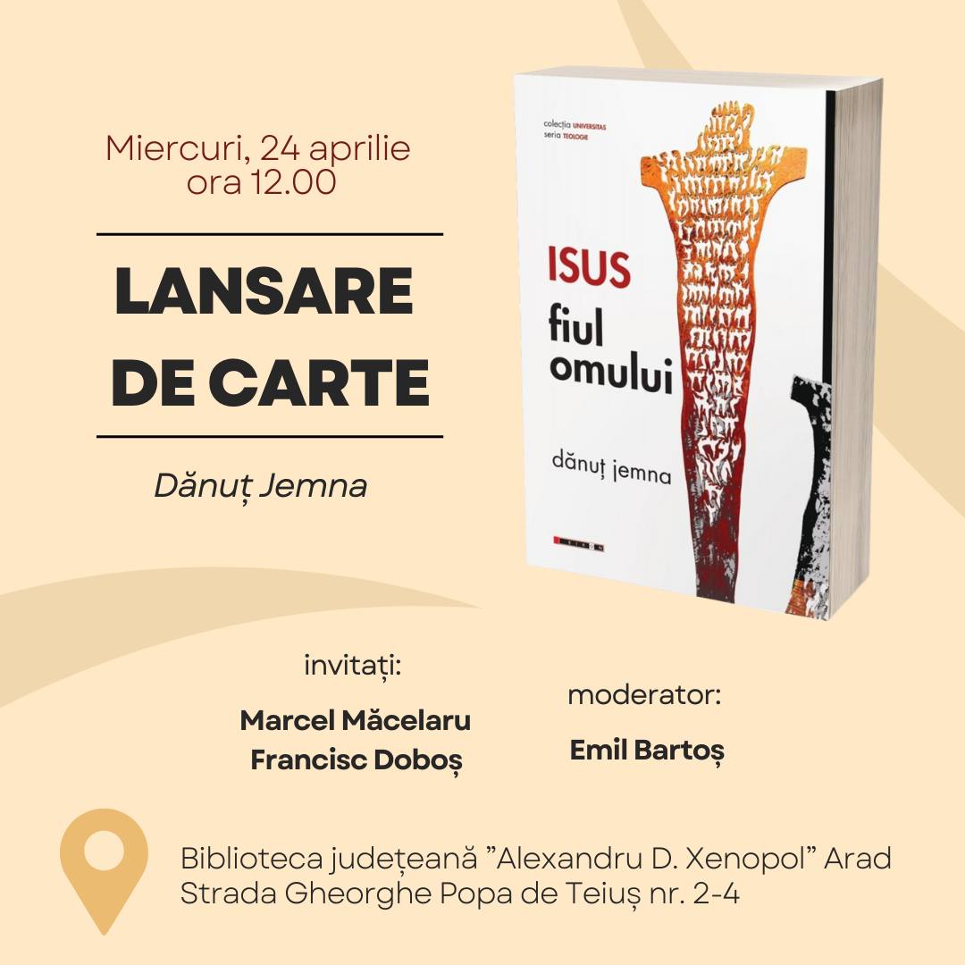 Miercuri, 24 aprilie, ora 12:00 Biblioteca Județeană „A.D. Xenopol” din Arad, găzduiește în Sala „Astra” lansarea de carte „Isus, Fiul Omului” scrisă de Dănuț Jemna. Cartea a apărut în 2023 la editura Eikon.