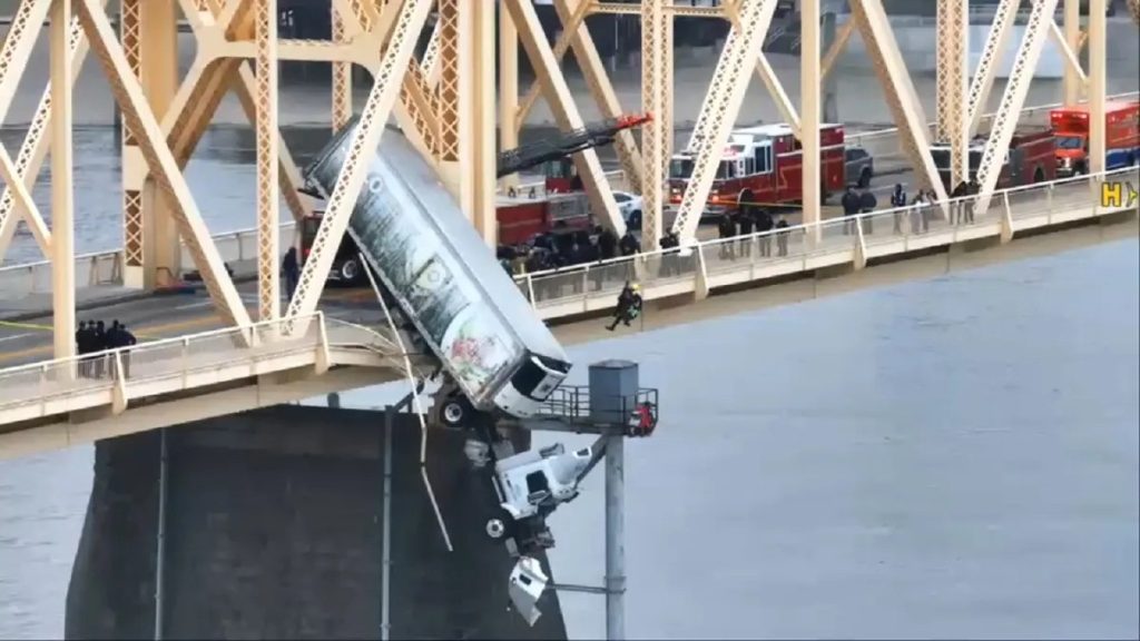 Sydney Thomas, o șoferiță în vârstă de 26 de ani, conducea camionul care în urma coliziunii a rupt bara de protecție a podului și a rămas atârnată deasupra rîului Ohio – imaginile sunt ireale.