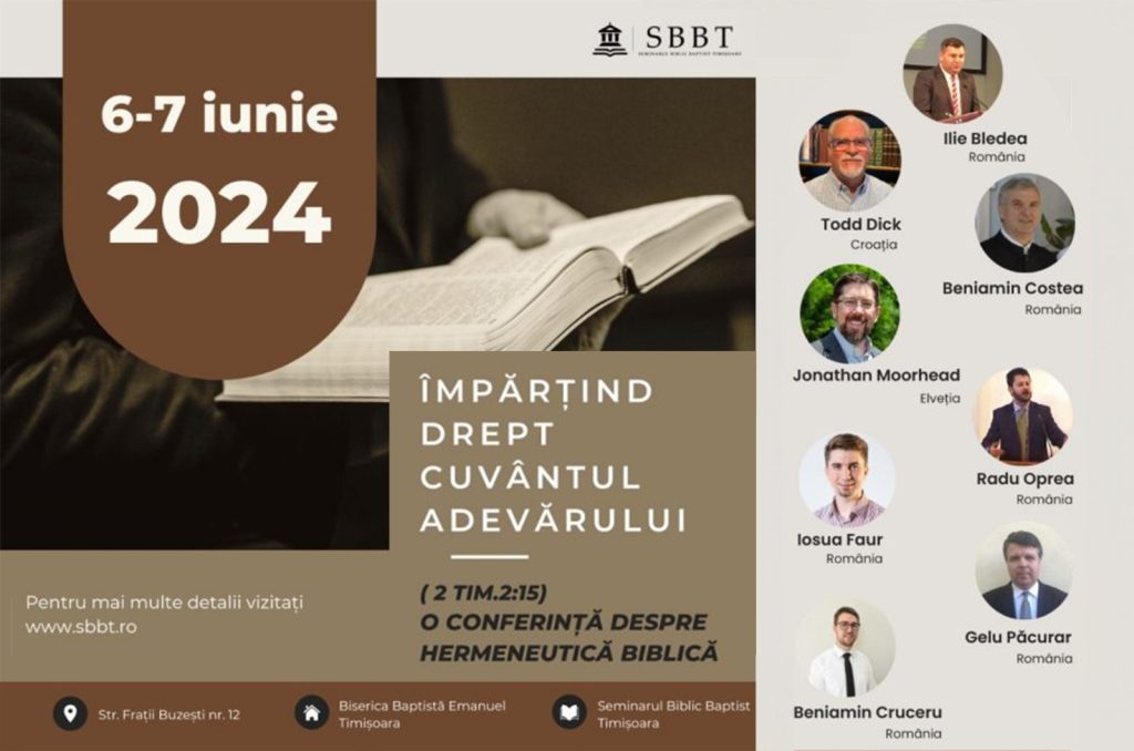 În perioada, 6-7 iunie 2024, Seminarul Biblic Baptist Timișoara și Biserica Baptistă „Emanuel” din Timișoara invită la o conferință dedicată unui subiect crucial în slujirea creștină și anume hermeneutica biblică.