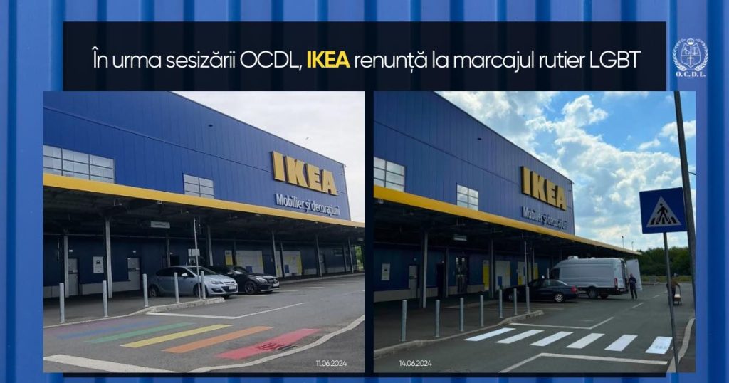 În urma sesizării OCDL, IKEA renunță la marcajul rutier LGBT. Dacă la începutul săptămânii eram întâmpinați la IKEA Timișoara pe un „covor” curcubeu – pentru că trecere de pietoni, potrivit legislației în vigoare în România, nu putea fi vorba – iată că la început de weekend s-a reintrat în legalitate, IKEA Timișoara revenind la gânduri mai bune prin refacerea trecerilor de pietoni în acord cu legislația în vigoare.