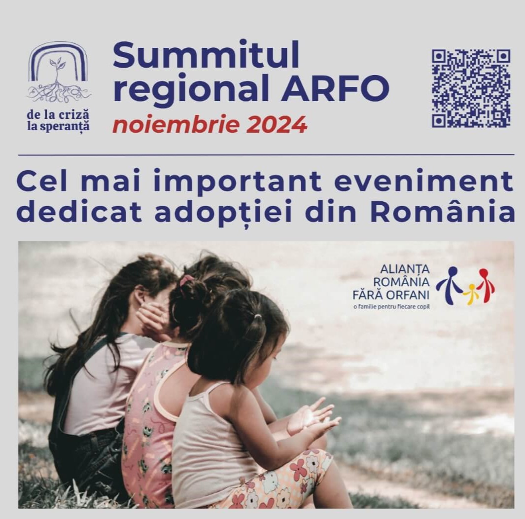 Alianța România Fără Orfani (ARFO) organizează în luna noiembrie, Summitul ARFO, cel mai important eveniment în domeniul adopției, în orașele Timișoara, Iași, București și Brașov. Ajuns la a XII-a ediție, ARFO 2024 prezintă povești inspiraționale și zeci de workshop-uri susținute de experți. Summitul din acest an ne invită să înțelegem mai profund criza copiilor vulnerabili din țara noastră și urgența acesteia. De asemenea, ne propune să ne mobilizăm împreuna pentru a descoperi modalități de a aduce bucurie în ochii celor mici care așteaptă să ajungă acasă.