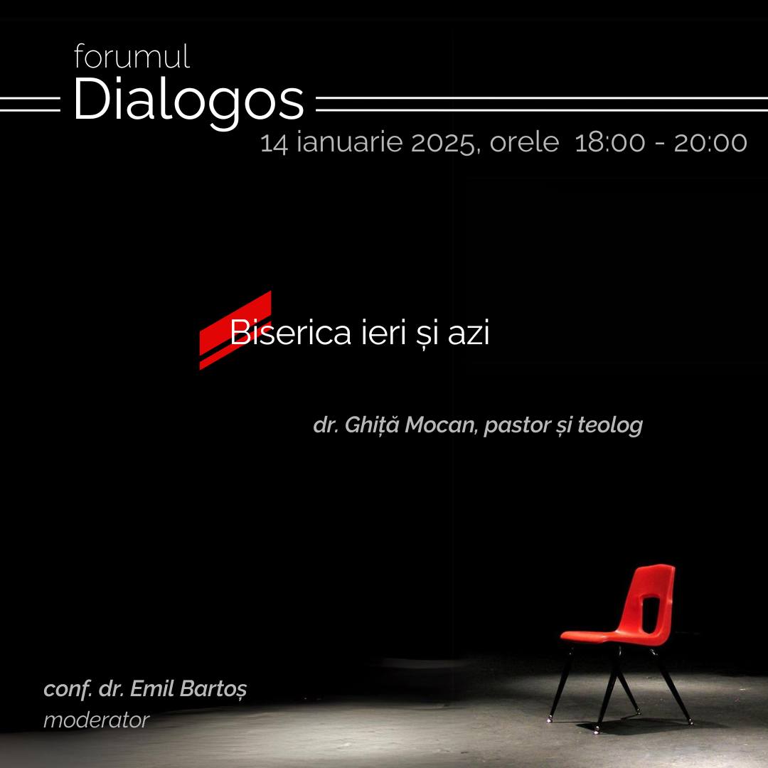 În sesiunea Forumului Dialogos din data de 14 ianuarie invitatul nostru, domnul Gheorghe Mocan, ne va conduce într-o explorare a rolului Bisericii în viața creștinilor și în Societate. Tema sesiunii este „Biserica ieri și azi”. Vor fi abordate teme legate de eclesiologie, precum învățătura Noului Testament cu privire la Biserică, tipologia celor șapte biserici din Asia Mică (Apoc. 2-3), provocările eclesiologice ale primelor secole, perspectivele eclesiologice ale principalelor tradiții creștine.