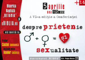 Biserica Baptistă „Betania“ București și eBIBLIA.ro vă invită la conferința pentru tineri și adolescenți: „Despre prietenie și sexualitate“ ediția a VI-a – un EVENIMENT MULTIMEDIA ce va avea loc la Biserica Baptistă „Betania“, Str. Popa Rusu 22, București, pe data de 5 aprilie, între orele: 12:00-16:00.