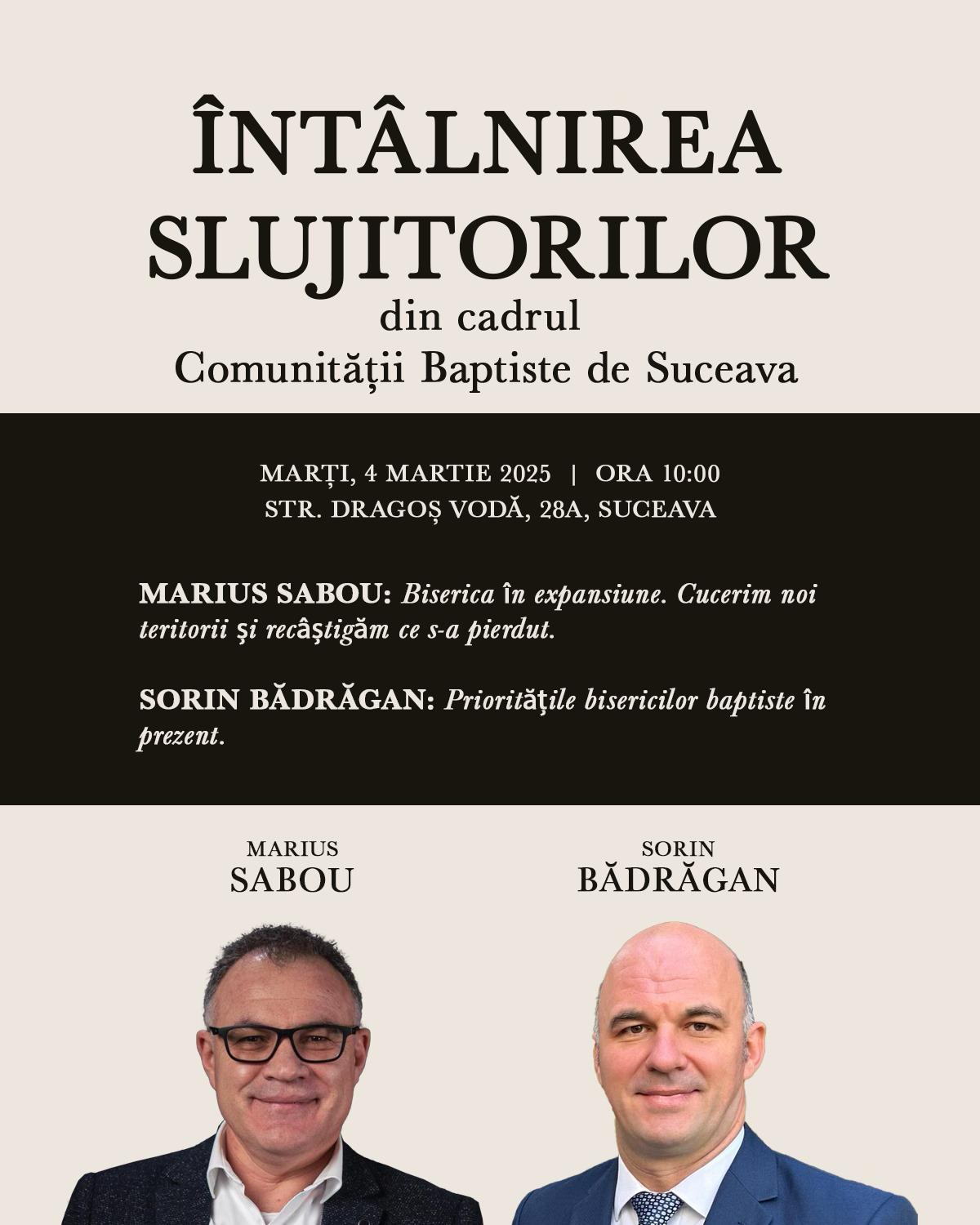 În data de marți, 4 martie, de la ora 10:00, la adresa Str. Dragoș Vodă, 28A, Suceava, va avea loc Întâlnirea slujitorilor din cadrul Comunității Baptiste din Suceava. Evenimentul reunește păstori, prezbiteri, diaconi, predicatori, evangheliști și învățători, având ca scop consolidarea misiunii bisericilor și identificarea priorităților actuale.