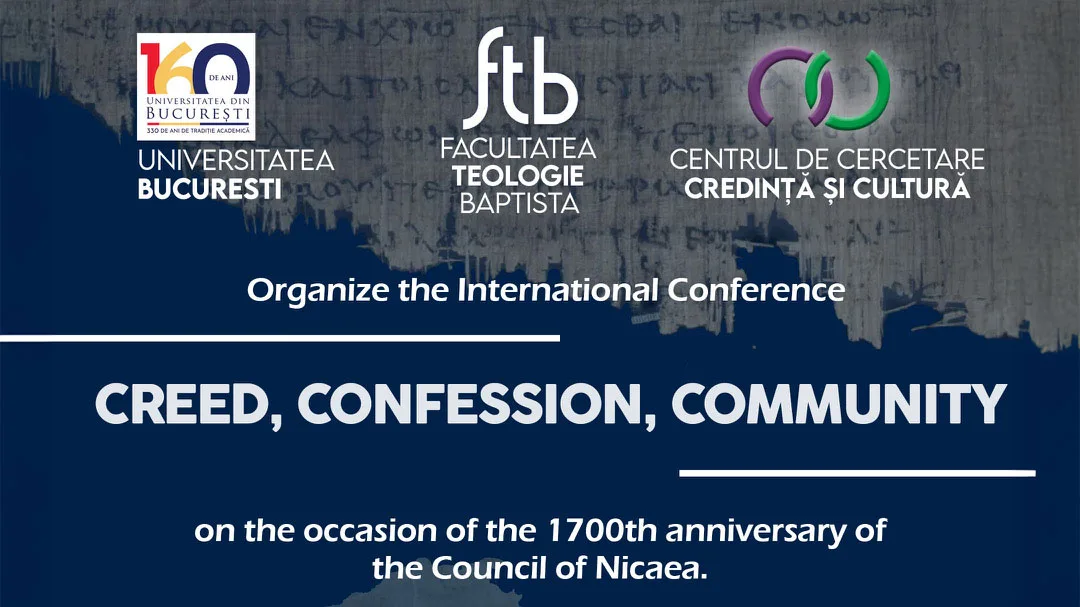 Facultatea de Teologie Baptistă a Universității din București, în parteneriat cu Centrul de Cercetare „Credință și Cultură”, organizează, în perioada 20–22 mai 2025, conferința internațională „Crez, Confesiune, Comunitate”. Evenimentul va avea loc la Institutul Teologic Baptist din București, în Sala Capela, și este dedicat marcării a 1700 de ani de la primul Sinod Ecumenic de la Niceea (325–2025), considerat un moment-cheie în conturarea doctrinei creștine.