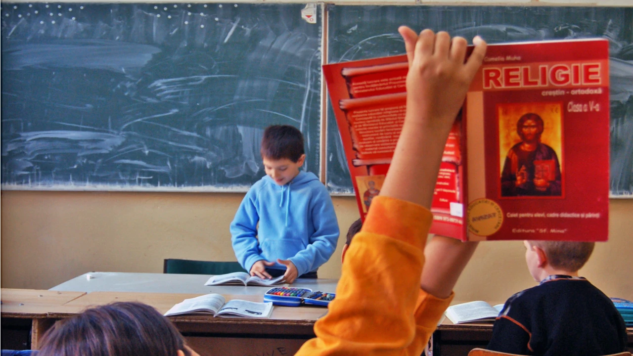 Profesorul de religie nu vorbește de pe solee. În fața lui sunt copii și tineri care au venit la școală, nu la biserică.