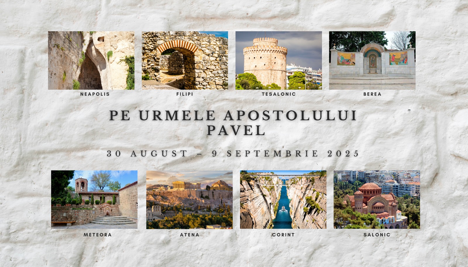 Zece zile pe urmele Apostolului Pavel. O călătorie spirituală în Grecia antică, acolo unde sau născut primele biserici din Europa. În perioada 30 august – 09 septembrie 2025 vino să vezi cu ochii tăi locurile unde a pășit Pavel și a lăsat în urma lui mărturii vii a dragostei lui Isus. Traseul include vizite în orașe istorice precum Filipi, Tesalonic, Berea, Atena și Corint — locuri-cheie în răspândirea Evangheliei în Europa. Evenimentul combină momente de reflecție spirituală, explorare culturală și relaxare, oferind o experiență completă de reconectare cu rădăcinile credinței creștine.