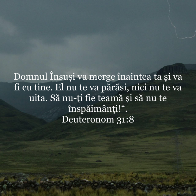 „Domnul Însuși va merge înaintea ta și va fi cu tine. El nu te va părăsi, nici nu te va uita. Să nu-ți fie teamă și să nu te înspăimânți!” Deuteronom 31:8 NTR