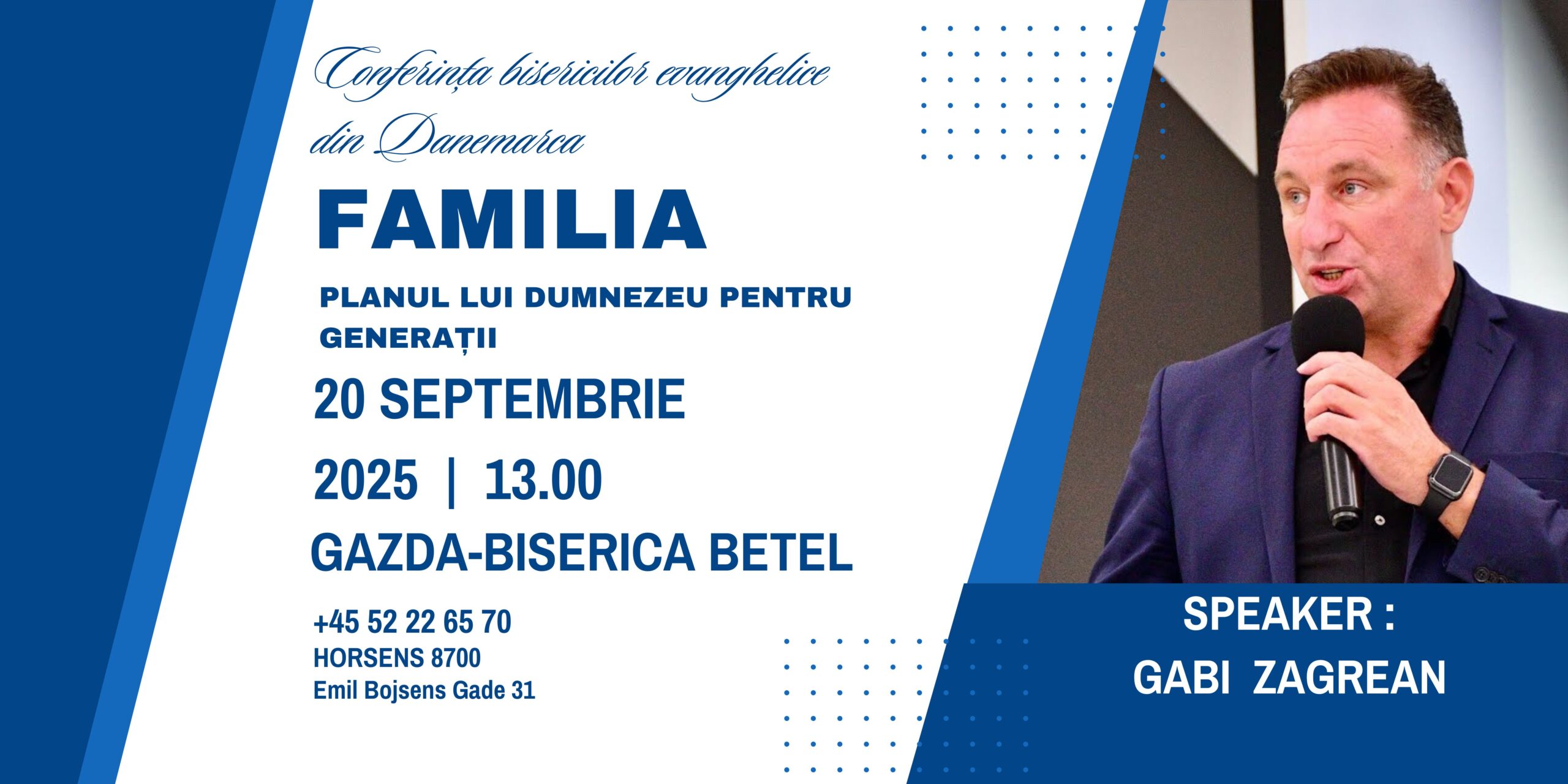 Pe 20 septembrie 2025, bisericile evanghelice din Danemarca se reunesc la Horsens pentru o conferință specială cu tema „Familia – planul lui Dumnezeu pentru generații”, avându-l ca invitat pe predicatorul Gabi Zăgrean.