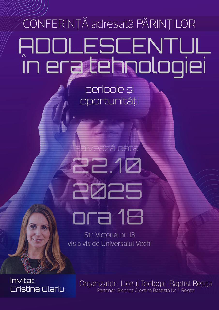 Liceul Teologic Baptist Reșița, în parteneriat cu Biserica Baptistă Nr. 1 Reșița, organizează miercuri, 22 octombrie 2025, conferința cu tema „Adolescentul în era tehnologiei”. Evenimentul este dedicat părinților care își doresc să înțeleagă mai bine provocările și oportunitățile educației în contextul lumii digitale.