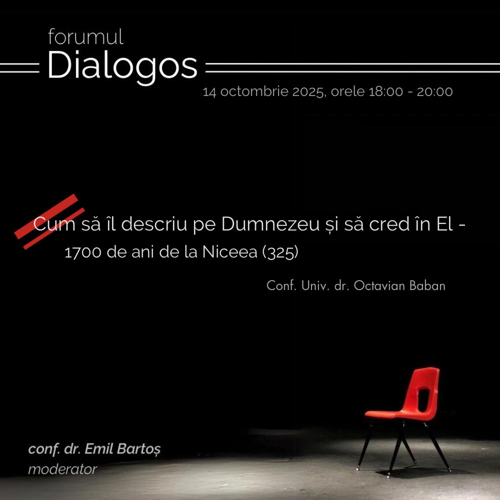 Forumul Dialogos reia seria de întâlniri din această toamnă, continuând tradiția dialogului teologic și cultural care apropie lumea academică de cea spirituală. Cea de-a XII-a sesiune îl are ca invitat pe conf. univ. dr. Octavian Baban, care va susține o prezentare cu tema: „Cum să Îl descriu pe Dumnezeu și să cred în El – 1700 de ani de la Niceea (325)”.