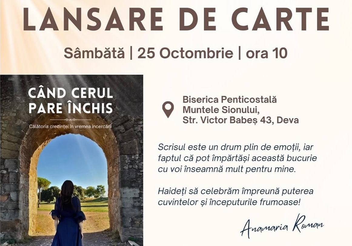 Biserica Penticostală „Muntele Sionului” din Deva va găzdui sâmbătă, 25 octombrie, lansarea volumului „Când cerul pare închis. Călătoria credinței în vremea încercării”, semnat de Anamaria Roman. Evenimentul promite să fie o celebrare a credinței, a cuvintelor și a începuturilor frumoase, reunind oameni care au descoperit puterea lui Hristos în mijlocul suferinței.