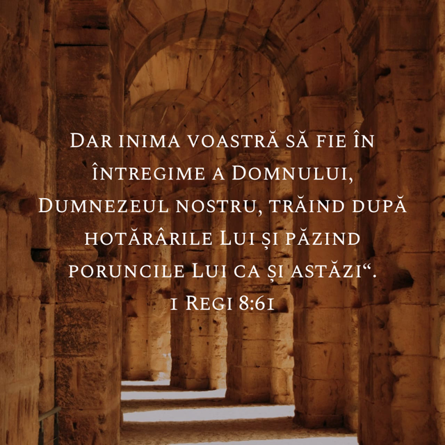 „Dar inima voastră să fie în întregime a Domnului, Dumnezeul nostru, trăind după hotărârile Lui și păzind poruncile Lui ca și astăzi”. 1 Împărați 8:61 (NTR)