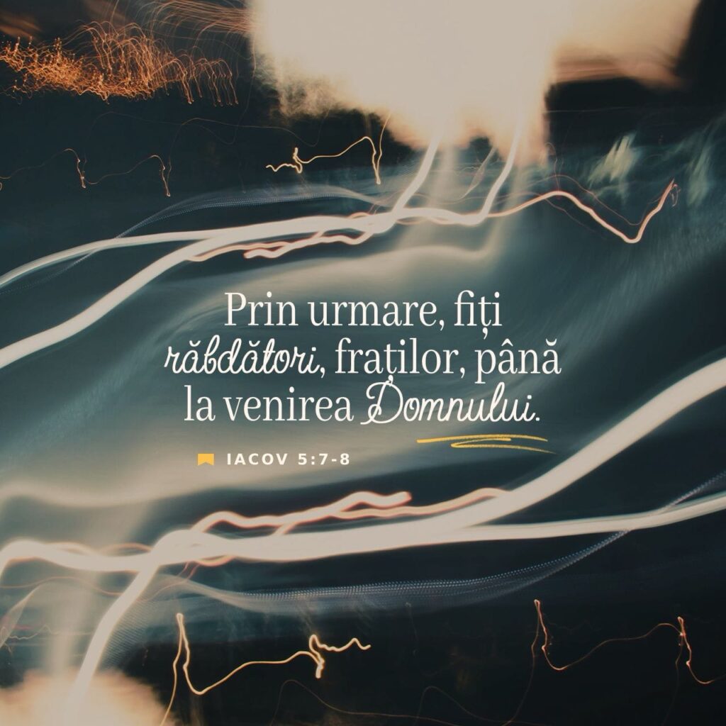 „Prin urmare, fiți răbdători, fraților, până la venirea Domnului. Iată că fermierul așteaptă rodul prețios al pământului, și-l așteaptă cu răbdare, până când primește ploaie timpurie și ploaie târzie. Fiți și voi răbdători și întăriți-vă inimile, pentru că venirea Domnului este aproape.” Iacov 5:7-8 NTR