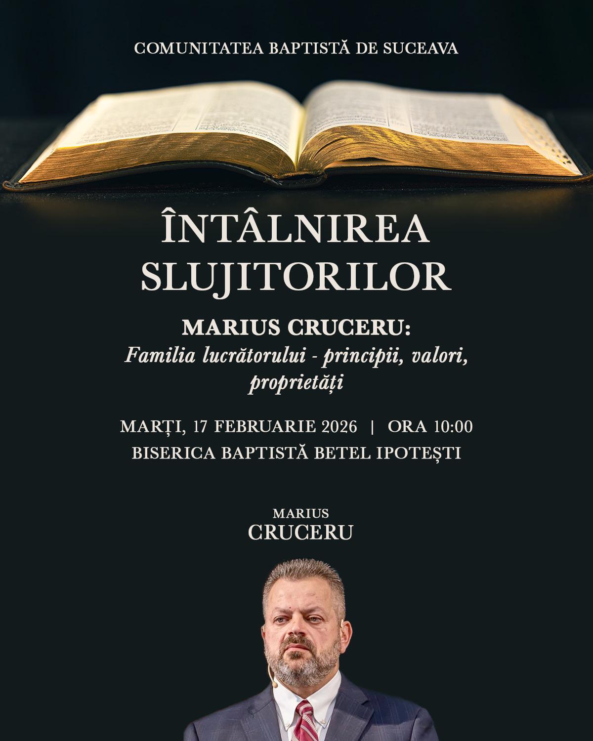 Împreună cu noi la întâlnirea de săptămâna aceasta, marți, 17 februarie, va fi și fratele Marius Cruceru, iar dumnealui va vorbi despre familia lucrătorului, mai precis despre principiile, valorile si proprietățile acesteia. Un subiect de o importanță biblică, spirituală, pastorală și practică majoră.