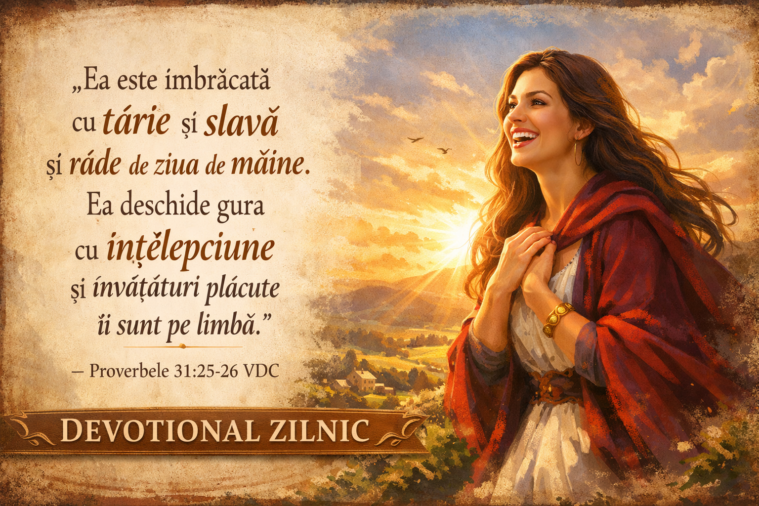 „Puterea și cinstea sunt îmbrăcămintea ei și râde de ziua de mâine. Ea își deschide gura cu înțelepciune, iar pe limba ei sunt învățături plăcute.”