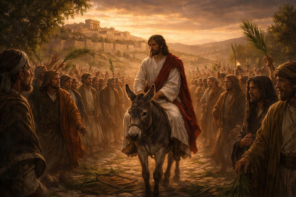 Sărbătoarea Intrării Domnului în Ierusalim începe cu strigăte de bucurie, dar se termină în lacrimi. Uralele pe care le aduc oamenii în sărbătoare au fost doar de pe vârful limbii, inima lor era legată de neant. A pășit o vreme pe jos, apoi călare pe un măgar a intrat triumfător în cetate. Mulți au fost confuzi, nu știau ce se petrece în jur.
